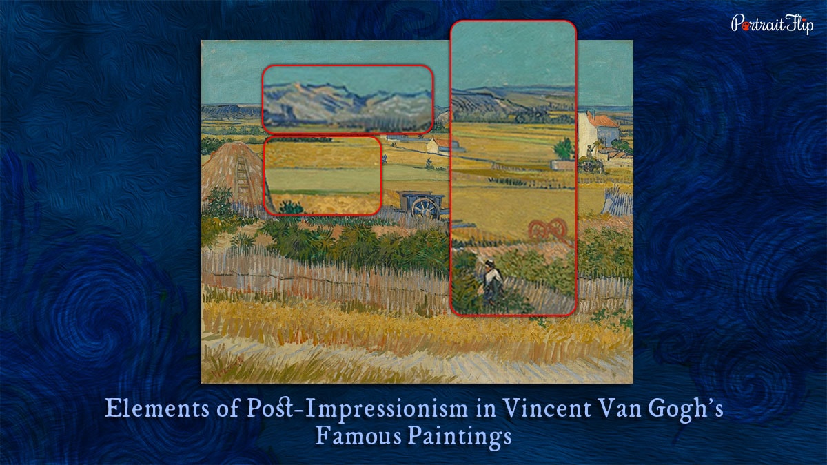 A complete example of this can be found in The Harvest painting by Van Gogh. Here’s a list of post-impressionist elements in The Harvest painting.